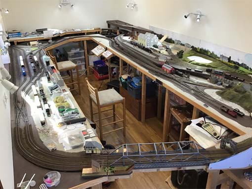 General View of Layout: Please note that this “is all work in progress”. Brecon Station complex to the right. Note the aforementioned country terminus baseboard installed far left. Also far upper right is a narrow gauge section with track already laid but in the longer term I might not develop this element. The back scene on the right is Camden Road in Brecon. Also there are two white control panels and a bank of Peco point levers (just visible far left). In the foreground is the lift up bridge section.